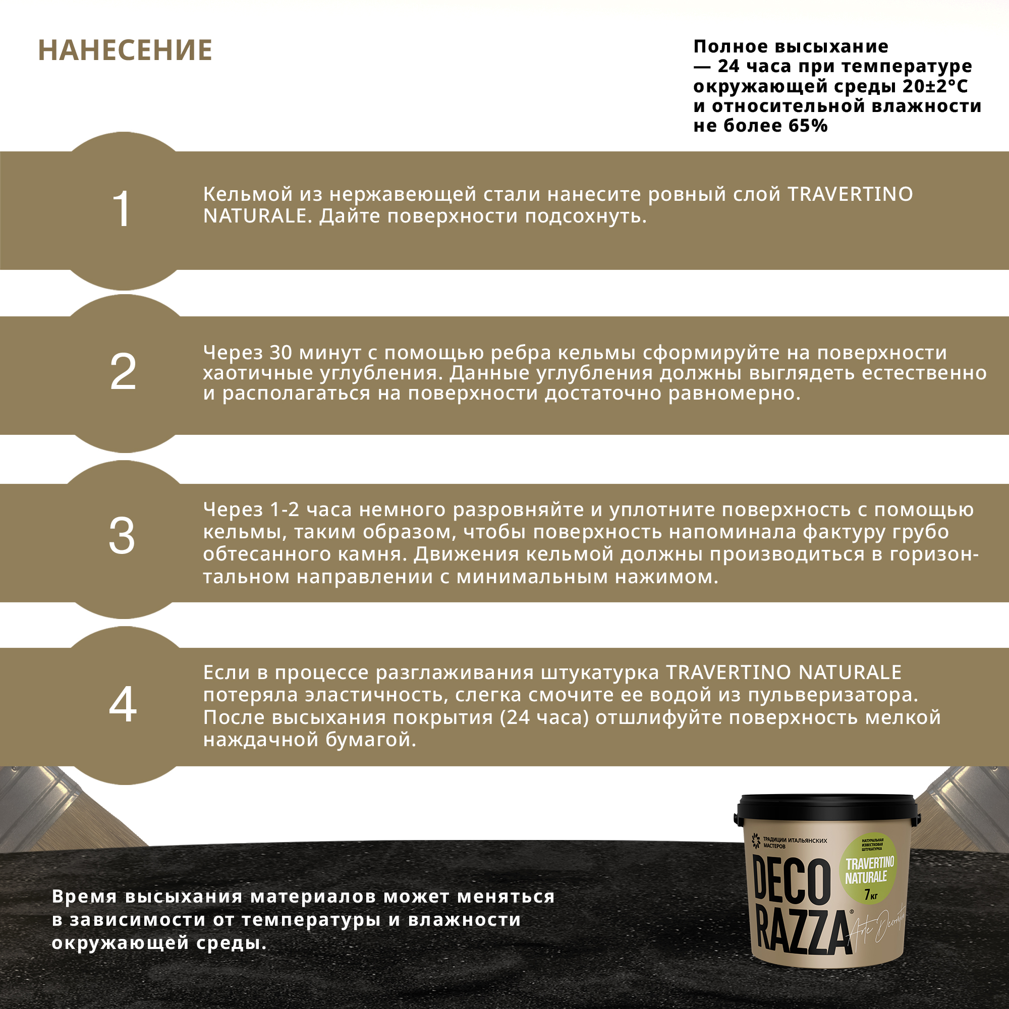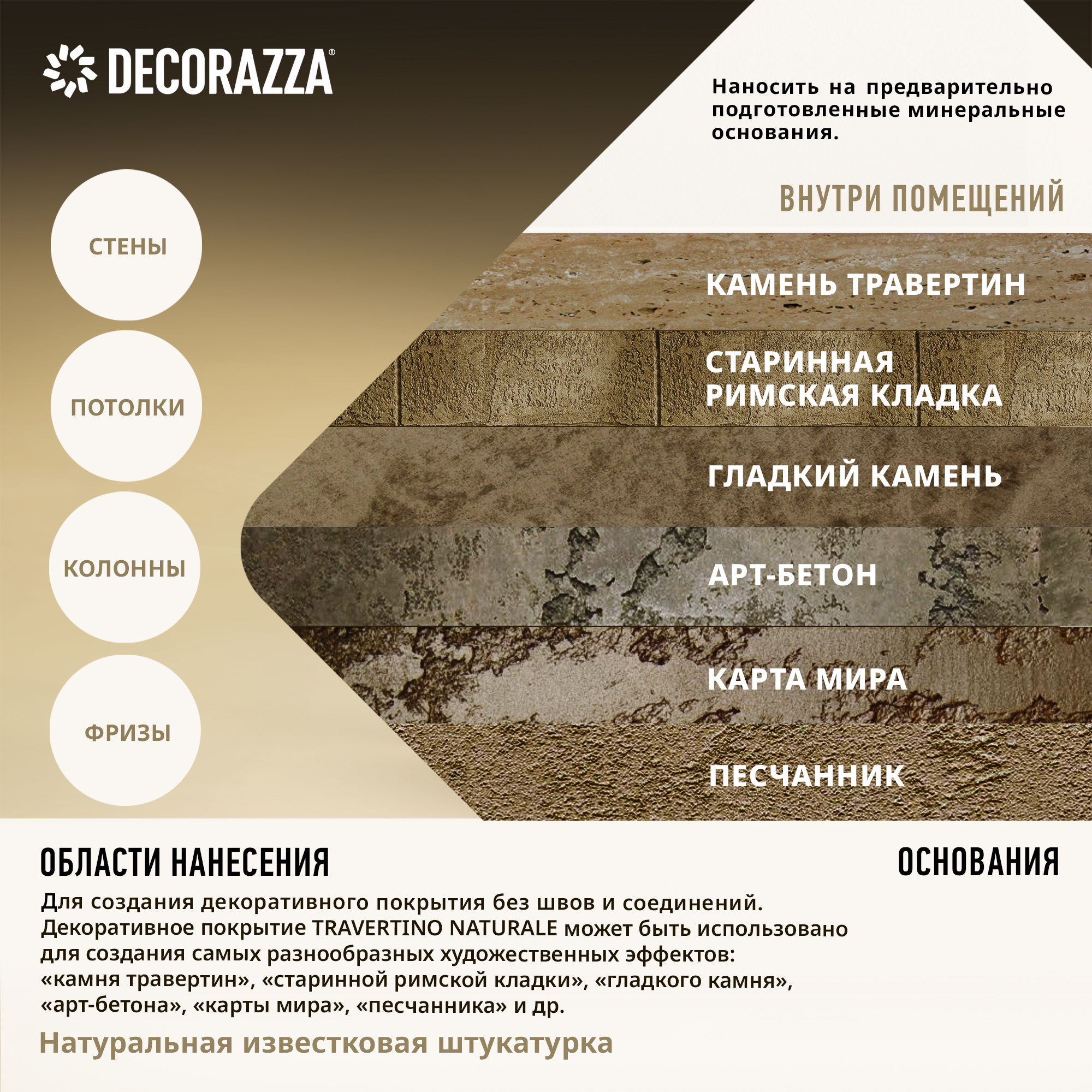 Декоративное покрытие Travertino naturale  -  Штукатурка для создания декоративного покрытия без швов и соединений на стенах, потолках, колоннах, фризах и других архитектурных деталях внутри помещений от бренда Decorazza с доставкой по России!