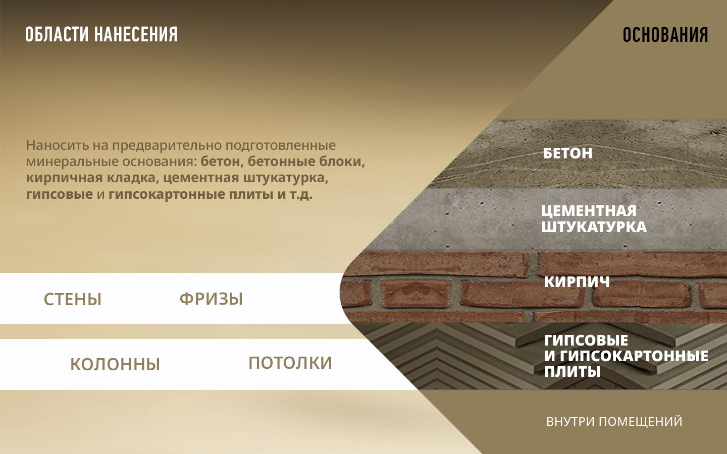 Для создания декоративного покрытия с эффектом перламутровых песчаных вихрей без швов и соединений на стенах, потолках, колоннах, фризах и других архитектурных деталях внутри помещений.