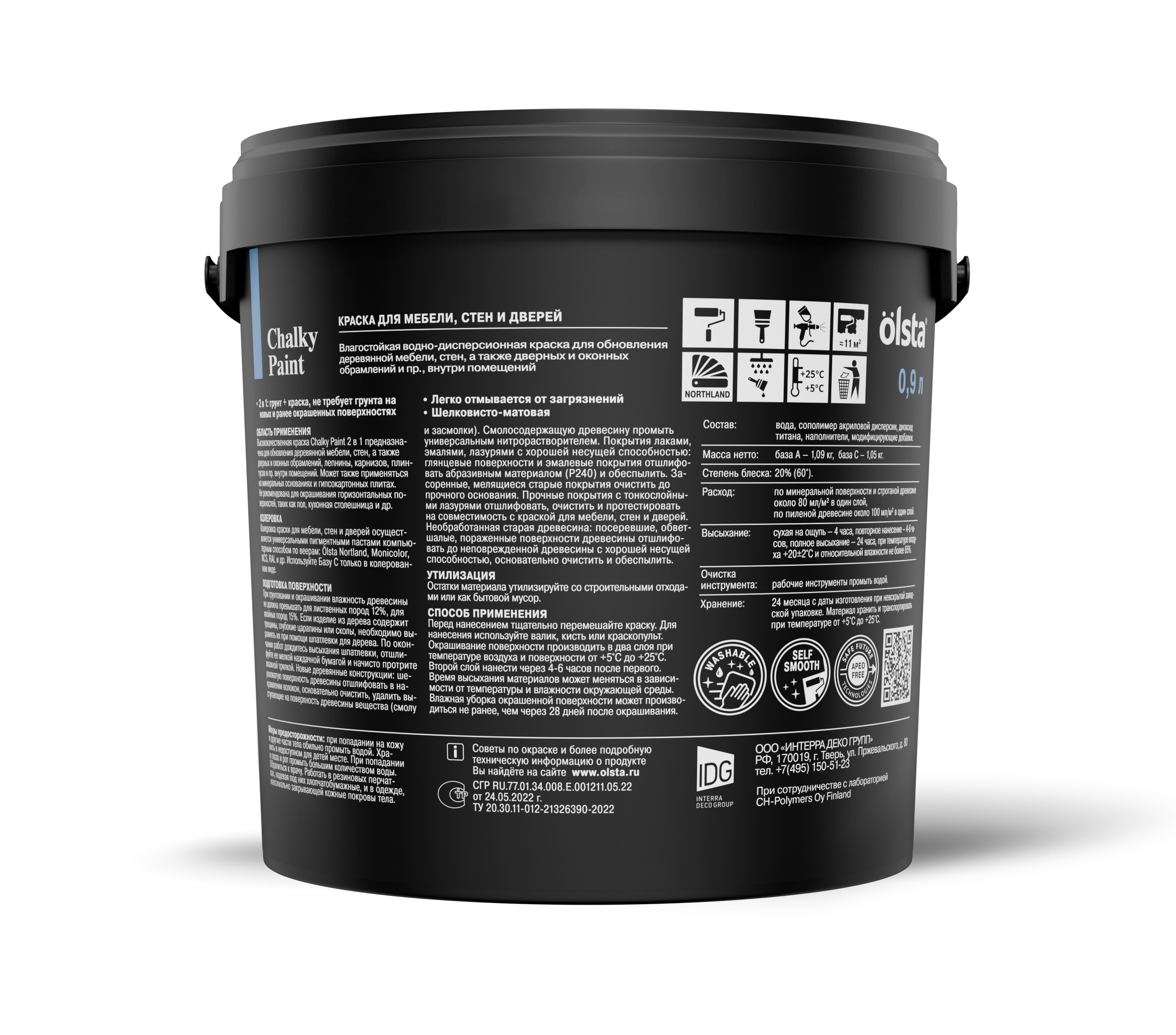 Краска для мебели меловая CHALKY PAINT - Краска для мебели меловая OLSTA CHALKY PAINT — это непревзойденное решение для тех, кто мечтает о стильной и долговечной мебели без лишних хлопот. Эта мебельная краска обладает уникальной матовой текстурой, напоминающей натуральный мел, что придает поверхности уютный и элегантный вид. Экологичная формула на водной основе гарантирует отсутствие неприятного запаха, делая процесс окрашивания комфортным как для вас, так и для вашего дома. OLSTA CHALKY PAINT отличается своей стойкостью к износу, обеспечивая долгие годы безупречного вида вашей мебели. Благодаря возможности колерования, вы можете подобрать идеальный оттенок под любой интерьер, создавая неповторимую атмосферу в каждом уголке вашего пространства. Используйте эту краску для обновления старых вещей или придания оригинальности новым предметам мебели, наслаждаясь безопасностью и качеством продукта, который отвечает всем современным требованиям экологии и дизайна. от бренда OLSTA с доставкой по России!